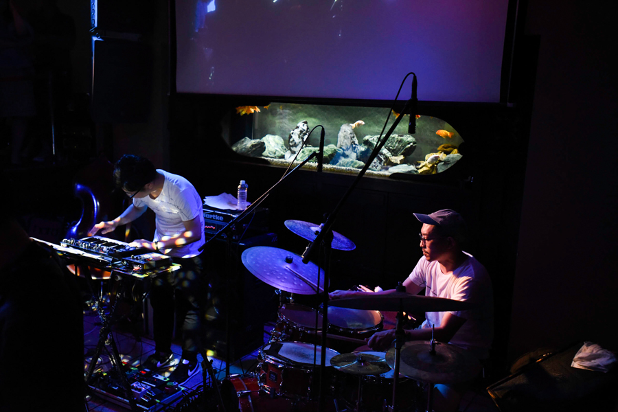 Yasei Collectiveのリズム・セクションである中西道彦(b)、松下マサナオ(dr)。メロディアスなフレーズと先鋭的なサウンド、ジャズの伝統と革新がせめぎ合うような音楽性からは、このバンドがすでに確固たる独創性を掴み取っていることが伝わってくる。