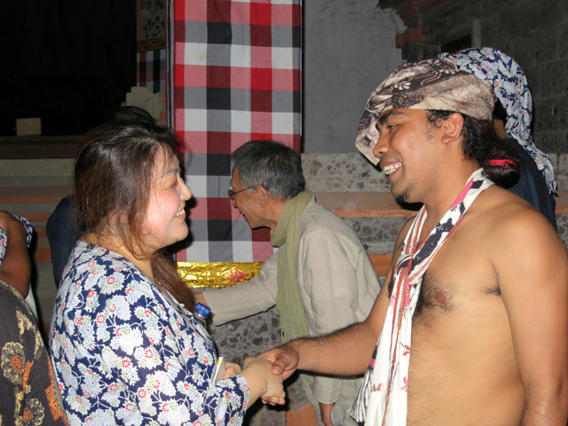 思いがけない偶然やハプニングが起こるのがバリ。旅立つ前から皆にそう言われていた。その偶然の導きなのか、川村亘平斎の誘いで、到着初日から貴重なウパチャラ(儀式)のガムラン演奏を観ることができた。奇しくも偉大なるプルギノ(ヴェテラン舞踊家)であったイ・クトゥッ・スウェチャ(あの鎌仲ひとみ監督の処女映画『スウェチャおじさん - バリ・夢・うつつ』主人公)のお通夜。故人と同じ舞台を踏んできたという奏者が集う輪の中には、滞空時間の師匠たちもいた。豚の生血が入ったウワサの儀礼料理ラワールを手食しながら、バリで聴く初めてのガムラン。芸に生きた人が、芸に生きる人によって送られていく。もしも夜空の星を叩いたらこんなキラキラした音が出るのではないか。そんな美しい高音が風に乗り、闇に溶け合い、空から降り注いでくるようだった。