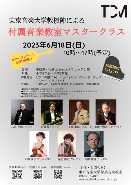 6月18日(日)に東京音楽大学が中目黒・代官山キャンパスにて、初の試みとして、小学4年生から中学2年生までを対象にピアノ(聴講のみ)・ヴァイオリン・ヴィオラ・チェロ・フルート・クラリネットのマスタークラスを開催します。