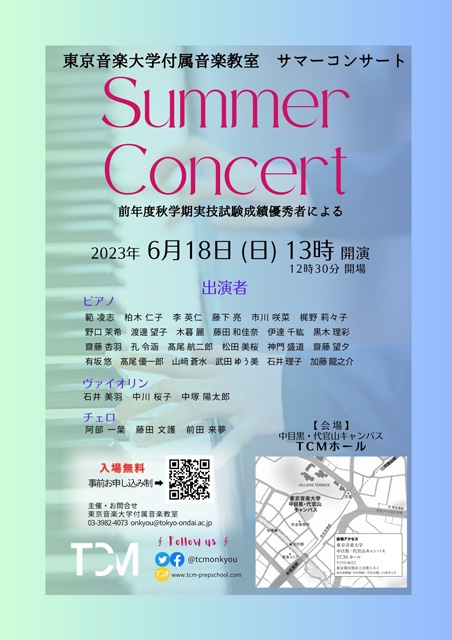 同時開催のサマーコンサートでは、東京音楽大学付属音楽教室で日々研鑽している小学2年生から、高校3年生までの成績優秀者(30名)による、無料コンサートもTCMホールで開催され、世界で活躍する音楽家を目指す子供たちの演奏を聴くことができます。