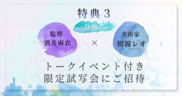 [NFT購入者限定の豪華特典][映画公開と同時にNFTの絵柄が劇中に登場する絵画に変わる映画オリジナルアート]NFTを購入した段階では、全てのNFTが共通のデザインですが、映画公開日になると、自動で劇中に登場する絵画のデザインへと変化します。実際に映画を劇場に観にいくことで、自分が保有しているNFTの絵画に込められた意味がわかる仕掛けになっています。付与されるデザインは全53種類。すべてランダムで購入者に付与され、どのデザインが自分のもとに届くのか、購入者の公開までのワクワク感を創出する仕掛けも特徴です。[全3,000種類!SNS等で利用できる映画オリジナルアイコンNFT]今回の映画公開を記念して、SNSのアイコンとして利用できるオリジナルNFTをプレゼントいたします。全3,000種類の全てデザインが異なる世界に一つだけのオリジナルデザインのNFTが手に入ります。SNSのアイコンに設定して、映画を一緒に盛り上げることができます。※アイコンデザインは開発中。[劇中に登場した絵画の実物]劇中に登場した絵画の実物を抽選で5名様にプレゼント。[トークイベント付き限定試写会への参加権]酒井麻衣監督と、劇中に登場する絵画の作画を担当された美術家の朝霧レオのトークイベント付き限定試写会への参加権が抽選で30名様に当たります。© 2023「夜が明けたら、いちばんに君に会いにいく」製作委員会