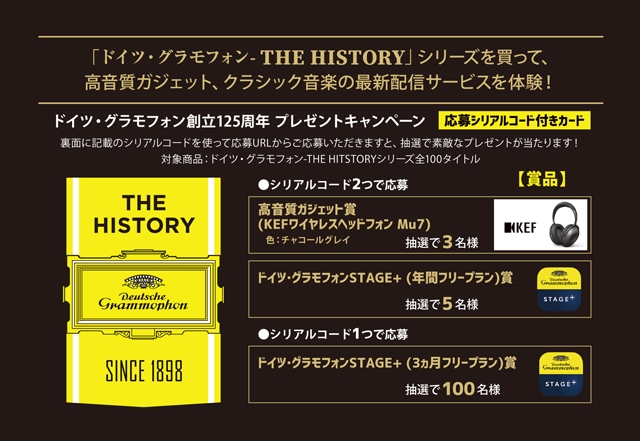 このキャンペーンは、今年4月から5月にかけてユニバーサル ミュージックよりリリースされたクラシック音楽の名盤シリーズ『ドイツ・グラモフォン-THE HISTORY』100タイトルを対象としたものになっており、期間中に対象シリーズのCDを購入して応募すると、高音質ガジェット賞として流線を描く彫刻の様なフォルムとピュアなハイレゾ・サウンドが融合したKEFの「ワイヤレスヘッドフォン Mu7」や、クラシック音楽に特化した映像&音楽配信サービス「STAGE+(ステージプラス)」のフリープランが抽選でプレゼントされます。