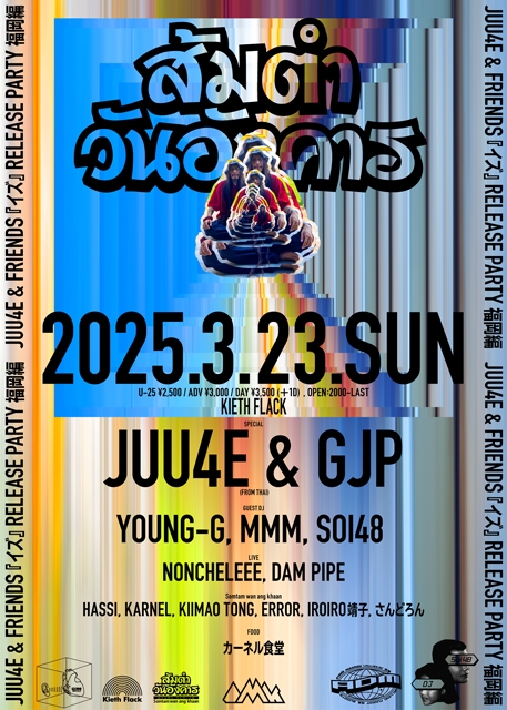 タイのヒップホップ・シーンにおいてOGとしてリスペクトを受けるラッパーのJUU4Eが、3月7日(金)に2作同時リリースする3rdアルバム『IS(イズ)』とミニ・アルバム『ソムタム侍GOLD』の発売を記念しレコ発ツアーを日韓合同で開催します。日本での日程は、3月23日(日)福岡・Kieth Flack、3月26日(水)大阪・ソーコアファクトリー(心斎橋)、3月30日(日)東京・新宿SPACE。そして、4月2日(水)には韓国・ソウル公演(詳細後日公開)が決定しています。