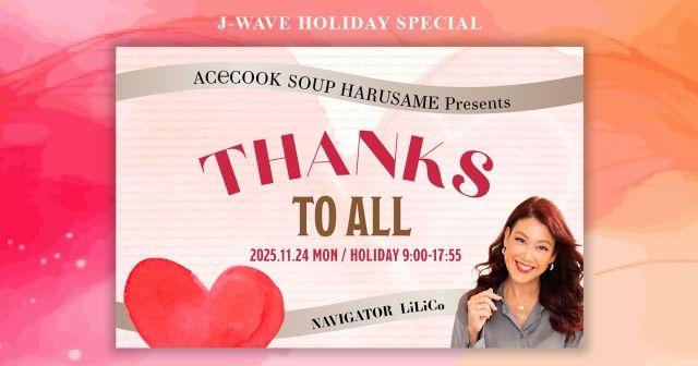 ラジオ局J-WAVE(81.3FM)では、11月24日(月・振休)9:00〜17:55、豪華出演者とナビゲーターでお届けする9時間のホリデースペシャル『J-WAVE HOLIDAY SPECIAL ACeCOOK Soup Harusame presents THANKS TO ALL』を放送します。