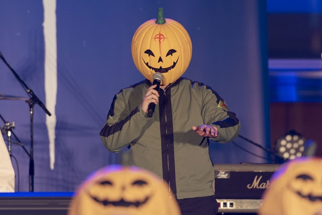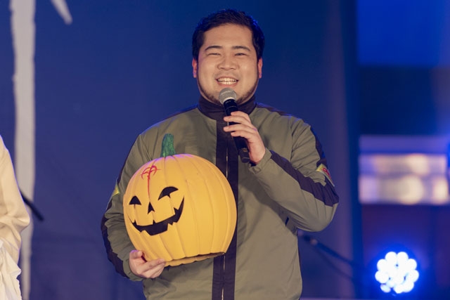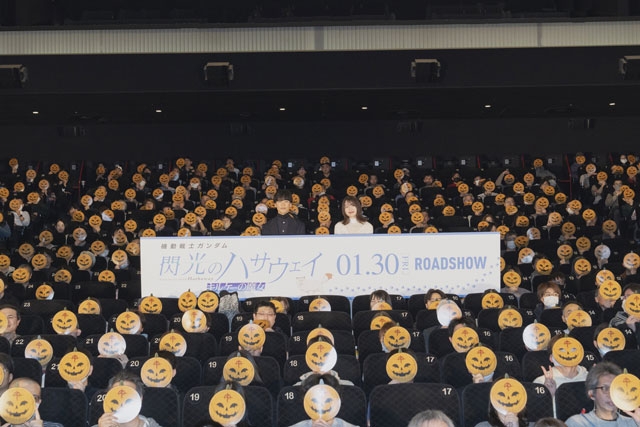 イベント中盤、突如として会場内のビジョンに“かぼちゃ頭”のマスクを被った人物が出現。場内が騒然となる中、主人公ハサウェイ・ノアがリーダーを務める反地球連邦政府運動「マフティー」を名乗り、そのまま張り詰めた空気の中ステージへ登場する。やがてかぼちゃの被り物を脱ぐと、公式SNSなどを通じて街中に出没し話題を集めていた“謎のかぼちゃ頭のボス”の正体が、M-1王者のお笑いコンビ・令和ロマンの松井ケムリであることが判明。意外すぎる正体に、会場は笑いと拍手に包まれた。松井は「なんで僕の顔を隠したいんだろうと思いました」と軽妙なジョークを飛ばしつつ、かぼちゃ頭のマスクについて「サイズがかなりタイトめに作られていて、被り心地は最悪です(笑)」と裏話を披露。終始、会場の笑いを誘った。これに対し小野も、「前作で(マフティーを)しっかりと成敗させて頂いたんですが、今回広報活動してくれてありがとうございます!」とコメントし、和やかな空気で会場を盛り上げた。