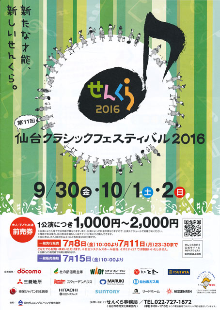 “せんくら”の愛称で親しまれ、“楽都”仙台の秋の風物詩として定着したクラシック音楽のお祭り〈仙台クラシックフェスティバル〉。第11回を数える〈仙台クラシックフェスティバル2016〉が、9月30日(金)、10月1日(土)、2日(日)の3日間にわたって開催されます。