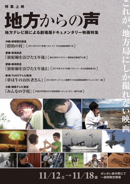 www.mmjp.or.jp/pole2/)では、地方のテレビ局が制作したドキュメンタリー映画の特集上映〈地方からの声〉を11月12日(土)〜18日(金)にかけて開催。上映ラインナップは、沖縄県高江のヘリパッド建設を追った「標的の村」(2013年 / 琉球朝日放送)をはじめ、「放射線を浴びたX年後」(12年 / 南海放送)、「放射線を浴びたX年後2」(15年 / 南海放送)、「夢は牛のお医者さん」(14年 / TeNYテレビ新潟)、「みんなの学校」(14年 / 関西テレビ放送)の5本。連日日替わりで上映され、鑑賞料金は1,300円均一となっています。