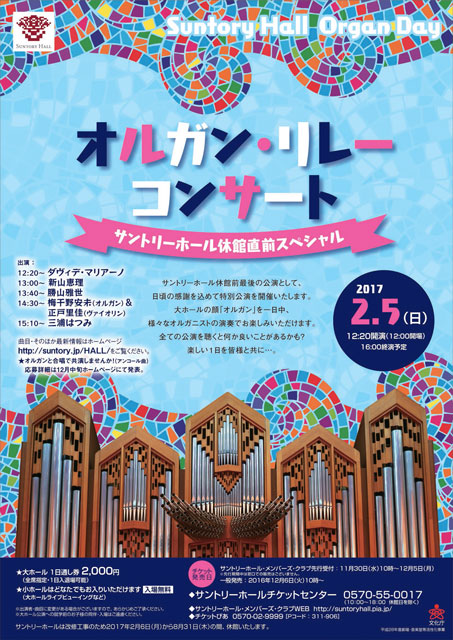 改修工事のため、2017年2月6日(月)〜8月31日(木)に休館する東京・赤坂のサントリーホール。休館前日の2月5日(日)12:20より、大ホールにて〈オルガン・リレー・コンサート サントリーホール休館直前スペシャル〉が開催されます。当日券(見切れ席)が2月5日(日)11:00から窓口にて販売されます。また、ブルーローズ(小ホール)では入場無料(出入り自由)。スクリーンで大ホールのライブビューイングが楽しめるほか、大ホール休憩中の14:05よりポジティフオルガンのミニ・コンサートが開催されます。