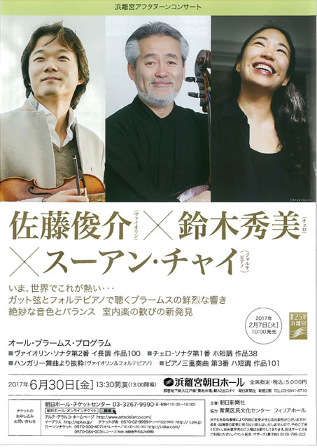 ブラームスの室内楽を演奏する公演〈浜離宮アフタヌーンコンサート 佐藤俊介(ヴァイオリン)×鈴木秀美(チェロ)×スーアン・チャイ(フォルテピアノ)〉が6月30日(金)東京・築地 浜離宮朝日ホールで開催。