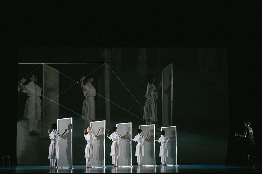 MUTEK〉が主催するフォーラム〈MUTEK_IMG〉での公演がワールドプレミアとなった〈discrete figures〉は、AIと機械学習アルゴリズムによるシステマイズ / オーガナイズのデータをコレオグラフに反映させ、人間の主観を超越したダンス表現を目指す試み。ダンスとリアルタイムで連動するグラフィックやオブジェクトが、数値化されたミラーリング身体を視覚化します。