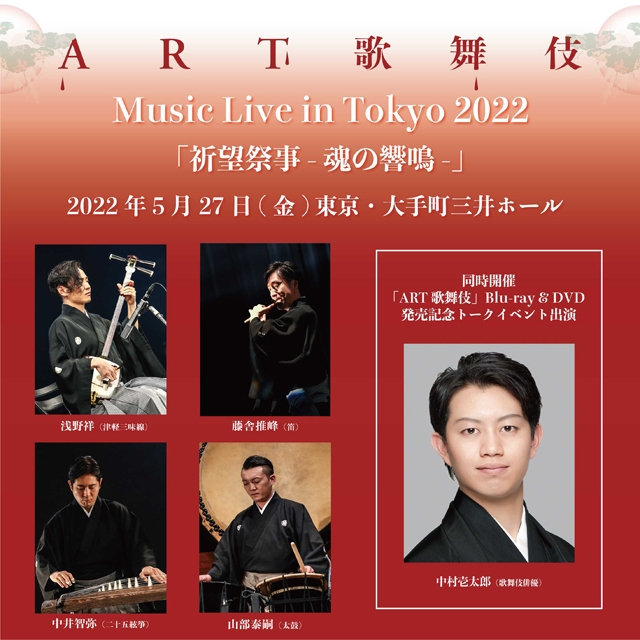 2020年に製作され、国内外で話題となった歌舞伎の映像作品『ART歌舞伎』(ファンタジア国際映画祭招待作品)より、とくに高い評価を受けた気鋭の和楽器演奏家4名からなる“ART歌舞伎楽団”が、京都・三重・岡山に続く公演を東京で開催します。5月27日(金)に東京・大手町 三井ホールで開催される公演「ART歌舞伎 Music Live in Tokyo 2022〈祈望祭事 -魂の響鳴-〉」では、『ART歌舞伎』のBlu-rayとDVDの発売を記念したトーク・イベントがあわせて開催され、中村壱太郎とART歌舞伎楽団が登壇します。