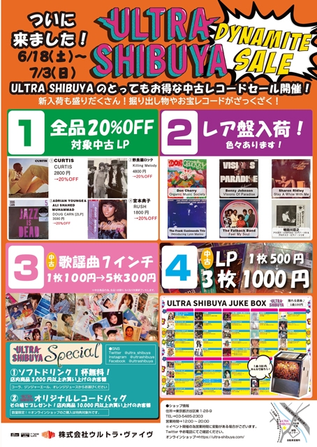 独立系レコード会社ウルトラ・ヴァイヴの直営ショップULTRA SHIBUYAが、レコードストアの祭典DRD Dropsに併せてセールを開催することが決定。期間は6月18日(土)〜7月3日(日)。