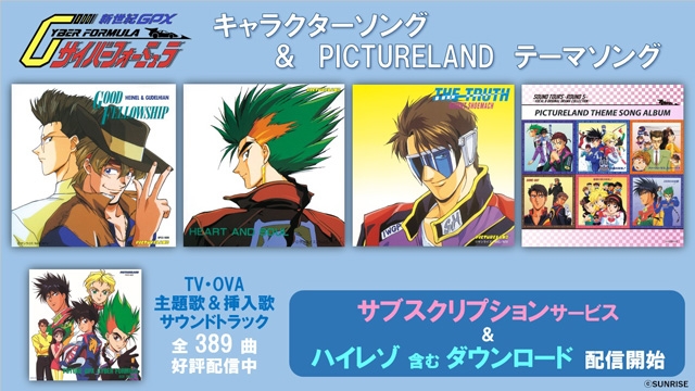 新世紀GPXサイバーフォーミュラ』より、3月末のオリジナル・サウンドトラックの配信、5月の一部キャラクター・ソングの配信に続いて、これまでCDでしか聴くことができなかったキャラクター・ソングとドラマCD「PICTURELAND」シリーズのテーマ・ソングを、サブスクリプション・サービスと、一部楽曲のハイレゾ含むダウンロード配信を各社サービスにて順次配信します。