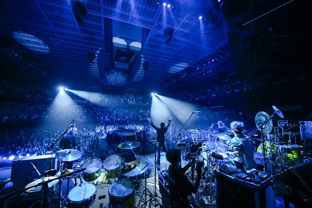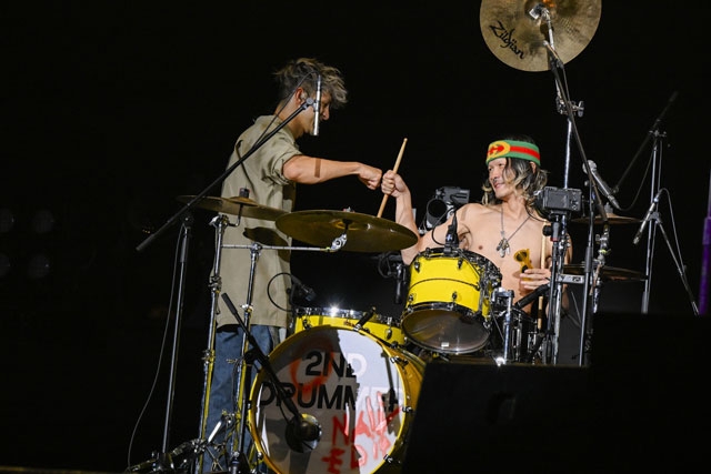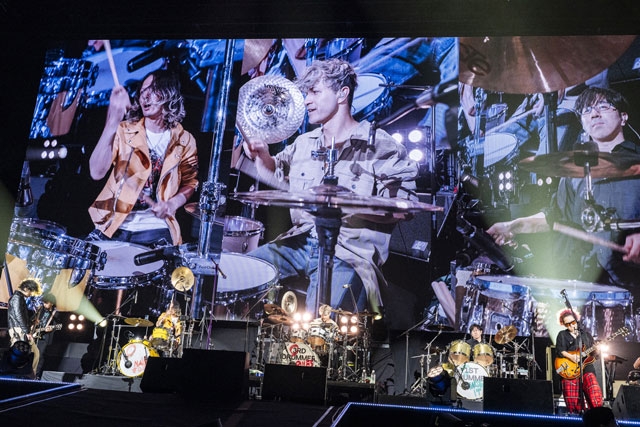 サプライズはこれだけでは終わらない。川上が「実はサトヤスの前にもうひとりドラマーがいたんです」と言って、1stアルバム『Where's My Potato?』を制作した後、バンドを離れた初代ドラマー・石川博基を呼び込んだ。石川が[Alexandros]でドラムを叩くのはタワーレコード渋谷店の地下でのライブ以来、約15年ぶり。楽曲は路上ライブ時代によくやっていた「温度差」だ。庄村と石川とリアドというトリプルドラム編成で「Adventure」を披露するというさらなる驚きもあった。〈Hello Hello Hello〉のシンガロングの中、川上は〈以前どこかで ドラムを叩いてましたか?〉と歌詞を変えて歌った。