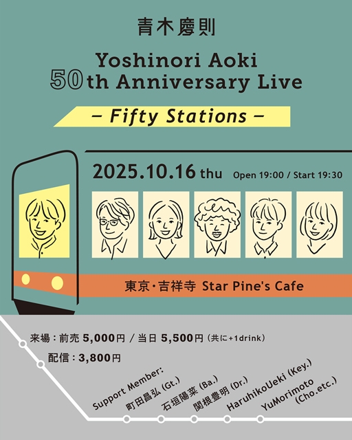 また、来場記念特典として、今回のライヴにちなんだ「青木慶則 50歳記念 オリジナル乗車券」をもれなくプレゼント。さらに、今回のライヴから販売する新しいグッズも鋭意制作中とのこと。グッズの詳細はライヴ当日に解禁されます。