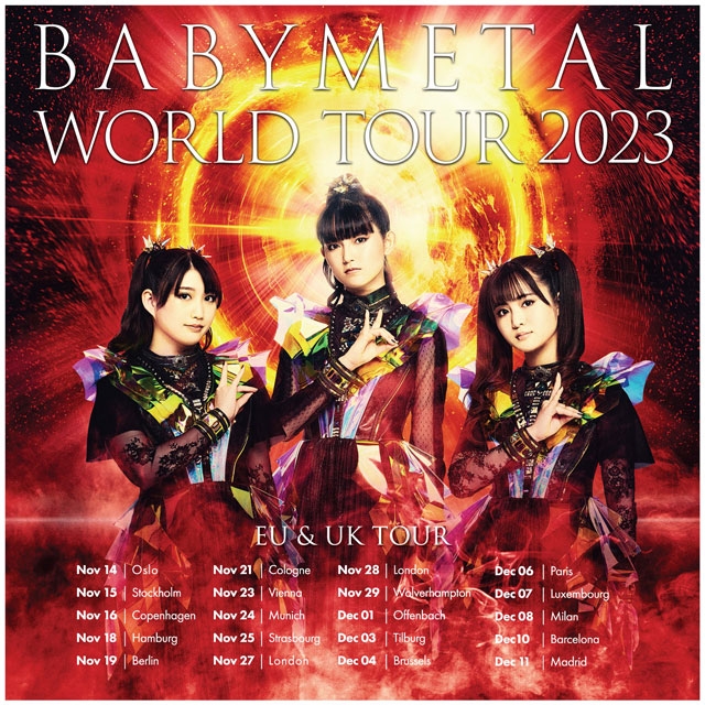 なおBABYMETALは、現在、スウェーデン出身のパワーメタル・バンド、サバトンのUK&EUツアーにスペシャル・ゲストとして参加中で、先日UK4ヵ所でのライヴを終えたばかりですが、早くも、11月から次のUK&EUを巡るワンマン・ツアーの日程が発表されました。〈BABYMETAL WORLD TOUR 2023〉の一環で、11月14日(火)のオスロ公演を皮切りに、UKのロンドン2公演、ウルヴァーハンプトンなどを巡り、12月11日(月)のマドリットまで12ヵ国20公演を行う予定です。現在敢行中のサバトンとのUK&EUツアー、5月末からスタートするBABYMETALにとって初のアジア&オーストラリアでのワンマン・ツアー、そして、8月末からのDETHKLOCKとの北米ツーマン・ツアーを合わせて、年内の海外公演は、24ヵ国81公演を予定しています。世界各国へと精力的に活動の幅を広げていくBABYMETALに引き続きご注目ください。