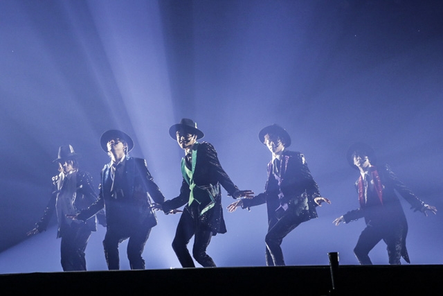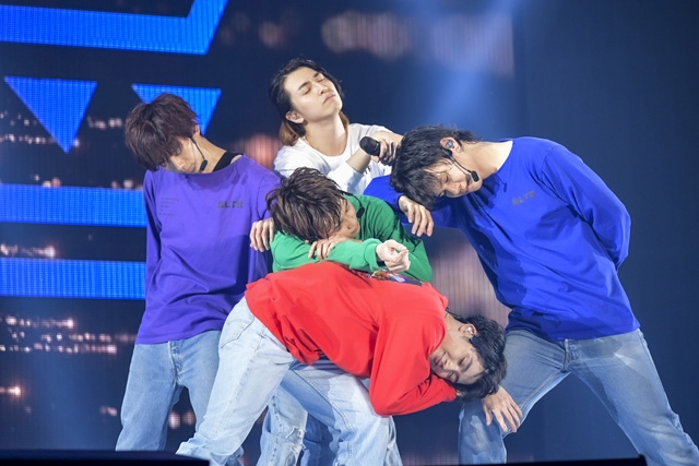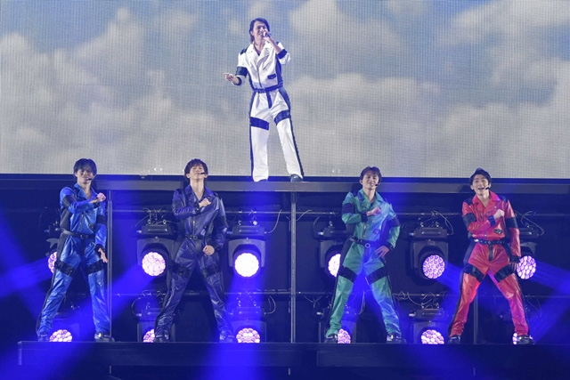 さらに、ライヴ・タイトル〈Superstar〉のロゴが大写しになったモニターを背に5人でクラップすると、メンバーカラーの音玉が打ちあがり、新たに生まれ変わった「超Superstar」を昨日に引き続き披露。それぞれの個性を反映したソロ・ダンス・リレーでは、モニターの色も踊るメンバーのカラーに変わり、タカシは“最後尾 みんな見守る”という従来の歌詞を“最後尾 みんな乗せていく”とリニューアルして決意表明。事実、ここ数年でシンガーとして目覚ましい成長を遂げている彼の進化は今回の公演でも明らかで、ハッとするようなフェイクやアレンジを聴かせてくれることも3日間でしばしば。時と状況に応じて柔軟に声色や技法を変え、リアルな感情を落とし込むたくましさは、歌い手にとって大きな武器といえます。