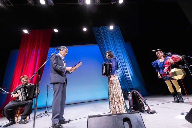 瀬戸弘司らアーティストから届いたお祝いコメントも流れました。ムービーが終わり、拍手が響くなかでアコーディオニストの