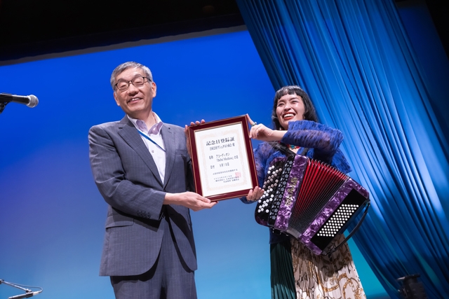 最後に、小春が「今日を記念日にしたかった」と9月18日を日本記念日協会に記念日として「アコーディオン Bébé Medusaの日」を申請して、認定されたことを発表。日本記念日協会の代表理事の加瀬清志が記念日登録証を持ってステージに現れ、桑山の軽やかなアコーディオンの音色に乗せて表彰式が行なわれると、Bébé Medusaを背負った100人ものアコーディオン奏者たちが歓喜の声を上げました。