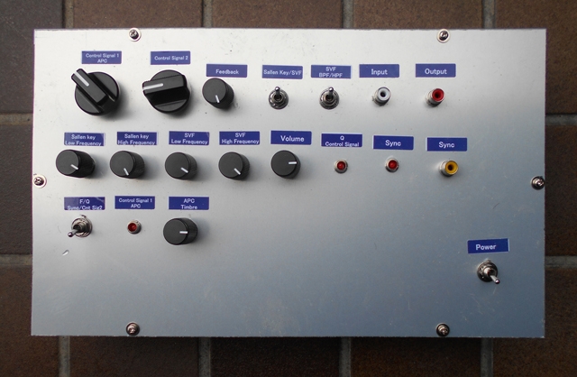 この作品を制作して、サレンキー回路のバンドパスフィルタの非反転増幅器を状態変数フィルタに置き換えたフィルタの評価を行いました。このフィルタのサレンキー回路のバンドパスフィルタはフィルタ1と呼び、状態変数フィルタは、フィルタ2と呼ぶことにします。前回は、フィルタ1の中心周波数とフィルタ2の遮断周波数または中心周波数をアナログフォトカプラで制御しました。今回は、フィルタ2の感度をアナログフォトカプラで制御します。ただし、音色を改善するために、フィルタ1の中心周波数は、可変抵抗で制御します。このアナログフォトカプラに入力する制御信号は、入力信号のpulse width modulation信号をバイナリカウンタで分周して、この信号をインバータで反転させた信号です。