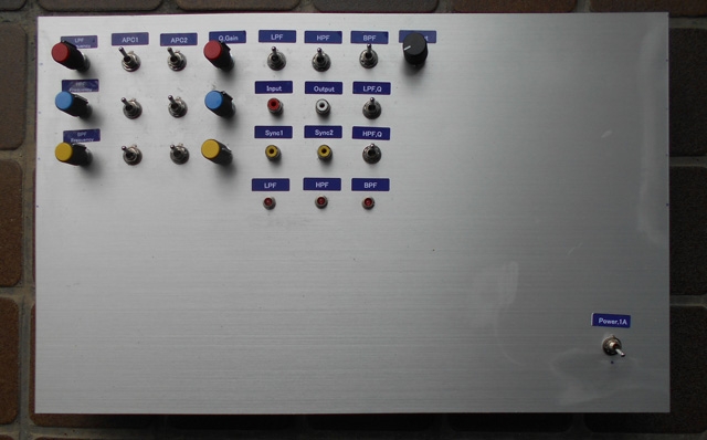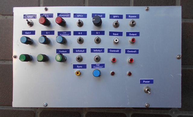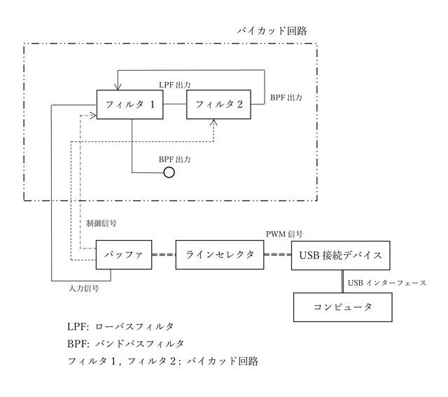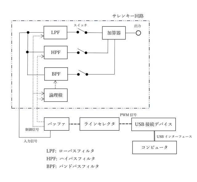 従来の制御信号は、USB接続デバイスから出力されるデジタル信号を用いています。本制御信号は、バッファから出力されるpulse width modulation(PWM)信号を用いています。USB接続デバイスから出力される1つのPWM信号と1つのデジタル信号は、オールパスフィルタのために用いていましたが、さらに、これらの信号も本制御信号に用いています。USB接続デバイスから出力される4つPWM信号は、ラインセレクタを経由してバッファに入力され、12のPWM信号がバッファから出力されます。特に、サレンキー回路とバイカッド回路は、制御信号にPWM信号を用いて斬新な音色を作ることができます。サレンキー回路は、ローパスフィルタ(LPF)、ハイパスフィルタ(HPF)及び、バンドパスフィルタ(BPF)の並列接続です。2つの制御信号は、LPFとHPFのアナログフォトカプラに入力して遮断周波数を制御します。2つの制御信号で論理積を行った信号は、BPFのアナログフォトカプラに入力して中心周波数を制御します。