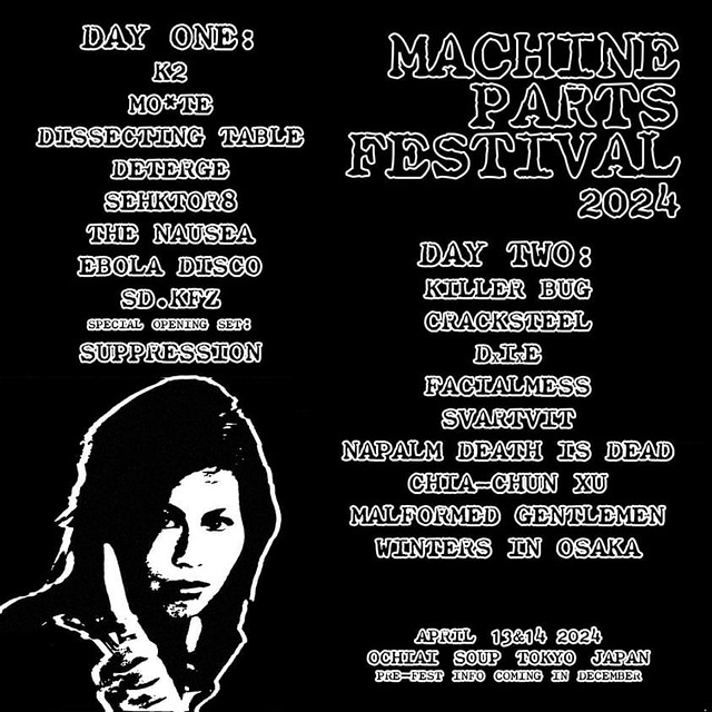また、Dissecting Tableは、4月13日(土)に東京・OCHIAI SOUPで行われるノイズ・イベント〈MACHINE PARTS FESTIVAL 2024[Day1]〉に出演予定です。その他の出演予定バンドは、SUPPRESSION、K2、MO*TE、DETERGE、SEHKTOR 8、THE NAUSEA、EBOLA DISCO、SD.KFZです。新旧のバンドが出演する怒涛のライヴになりそうです。是非、ノイズミュージックの中枢OCHIAI SOUPにご来場ください。