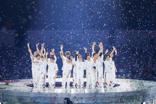 そして最後に、ATSUSHIの口から重大なメッセージが告げられた。「本日、限定復活を前言撤回させていただき、EXILE完全復活とさせていただきます!」という完全復活宣言である。場内に充満する拍手を代表して、もともとEXILEファンだったというTAKAHIROも「おかえりなさーい!」と笑顔でお出迎え。14人での再スタートを決めたEXILEは、岩田剛典の“年末特番風”曲紹介で気合いを入れると、17人でラストナンバー「Choo Choo TRAIN」を披露した。“強めのポップ”がカッコよく決まった先頭・MATSUから、最後列でなんとか顔を覗かせようと必死な最年少・佐藤大樹に受け継がれていく、パワフルなロールダンスは圧巻。その姿はまさに、EXILEが作り上げた20年の歴史そのものであった。