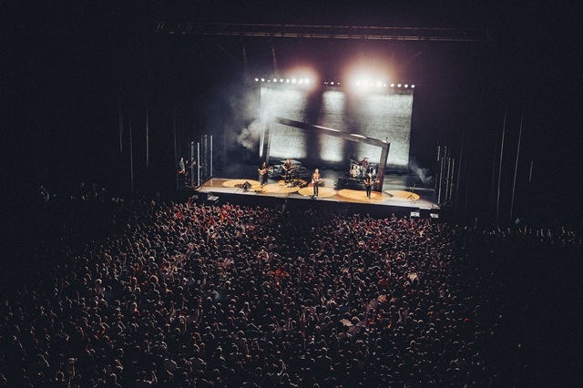 これで次が最後の曲かと思っていると、さらに低くうねるサイケデリックなベースリフが聞こえ「Ulysses」へ。ダブレゲエのグルーヴとサビのスケール感のなか〈La La La…〉の享楽的なサビで大合唱が起こる。夜のイメージ繋がりとも言えるヘヴィでダークなシンセのヴァイヴがダンサブルな「Hooked」へ。