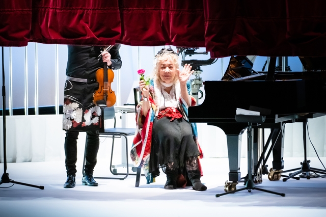 ひとしきり拍手を受けたフジコは、座ってドビュッシーの「月の光」を弾き始める。頭上のカメラがフジコの指先とともに、赤や銀の配色があでやかな衣装を映し出す。この衣装はフジコ自身が制作したものだ。「大正時代の着物をアレンジしたの。ヨーロッパで意見を聞くと、『衣装はドレスより着物のほうがいい』ってみんな言うからね。あれはパリで羽織をはおって歩いてるフランス人の男の人がいて、すごくいいなと思って私も真似してみたの(笑)」とフジコ。ステージ全体の色合いと調和して、通常のクラシック・コンサートとは異質の楽しさを醸し出す。