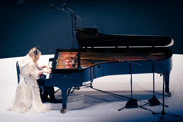 真上からピアノとフジコを俯瞰するカメラと、手元をクローズアップするカメラの映像が、ステージ左右に配されたスクリーンに映し出される。想像以上の迫力と美しさに、オーディエンスは釘付けになる。耳と目に鮮烈な刺激を受けて、オーディエンスはフジコの世界に深く浸っていく。