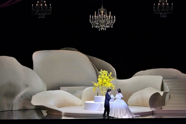 オペラ『椿姫』は、イタリアの作曲家ジュゼッペ・ヴェルディの代表作のひとつ。数あるオペラの中で、もっとも多く上演されている人気の演目です。作品は全3幕からなり、「乾杯の歌」や「ああ、それは彼の人か〜花から花へ」といったおなじみの劇中歌など、歌とオーケストラによる美しい音楽を楽しめます。物語の舞台は19世紀のパリ。社交界の華ヴィオレッタと南フランスから来た貴族の青年アルフレードの、身分の差に苦しむ二人の悲しいラブストーリーが描かれます。当時のパリの社交界をイメージして製作されたオーセンティックな衣裳に、豪華絢爛な舞台、そして、煌びやかなダンサーが登場する社交界シーンなど、見どころが満載です。