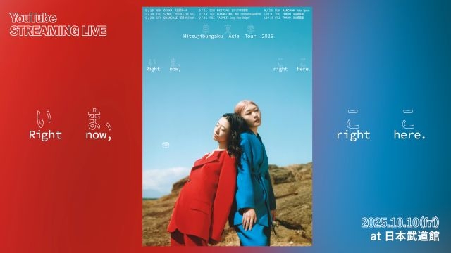 アルバムのリリースを記念して、アジア・ツアー〈Hitsujibungaku Asia Tour 2025 “いま、ここ (Right now, right here.)”〉のファイナルを飾る、日本武道館公演Day2がYouTube Liveにて一部生配信されることが決定しています。