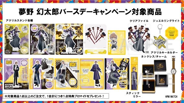 また、「ヒプノシスマイクオフィシャルグッズストア」でのバースデー・キャンペーンもスタート。誕生日を迎えたキャラクターのグッズを購入すると1会計毎に記念ブロマイドがプレゼントされます。こちらも1週間限定での企画となっており、夢野幻太郎「ヒプノシスマイクオフィシャルグッズストア」バースデー・キャンペーンは4月7日(日)23時59分までの実施となります。こちらも是非チェックしてください。