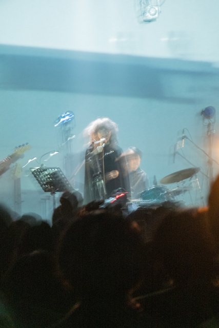 Twin Peaks』劇中歌など浮遊感あふれる楽曲群で、ライヴ前の会場を心地よいムードで満たす中、オーケストラのSEが流れると石橋英子が登場。観客への深いおじぎで厳かに始まった、冒頭曲であり先行公開曲「October」では、漂うようなメロディを歌う石橋英子の柔らかく幽玄な声、畳みかけるように歌うパートの緊張感など、訪れた人たちを一気にステージに引き付けます。同じく先行曲「Coma」では、ermhoiとのハーモニーや管楽器のソロフレーズも際立ち、曲の終わりには歓声も。