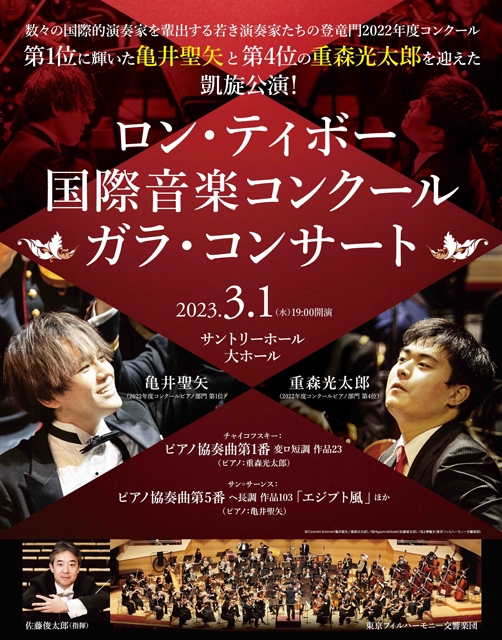 亀井聖矢と4位入賞の重森光太郎が出演する〈ロン・ティボー国際音楽コンクール ガラ・コンサート〉が、2023年3月1日(水)に東京・サントリーホール 大ホールで開催されます。