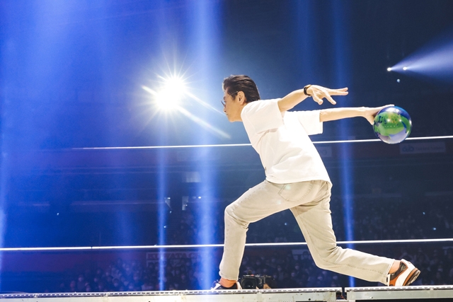 [オフィシャル・レポート] 司会の住吉美紀、矢野武のアナウンスをきっかけに決勝大会午後の部がスタート。7,000人の熱気が会場を渦巻き、割れんばかりの拍手が鳴り響く中、出場するプロボウラー6名が入場し壇上にラインナップ。これから始まる大会への期待が高まる。貴賓席には日本のボウリング業界の礎を築いてきたレジェンドボウラー岩上太郎、石井利枝、酒井武雄、斉藤志乃ぶ、矢島純一という錚々たる面々が。始球式は、2019年大会で優勝を飾った中野麻理子プロ、志摩竜太郎プロの2名が務めた。そして、この大会の旗振り役であり、2月26日に67歳の誕生日を迎えた自称“コミッショナー”桑田佳祐が、スティーヴィー・ワンダーの名曲「HAPPY BIRTHDAY」にのせて登場。開会宣言を務め、華々しくプロボウラー部門決勝の火蓋を切った。