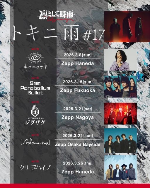 2023年以来の開催となる今回は、来年3月8日(日)のZepp Haneda(TOKYO)公演にキタニタツヤ、3月15日(日)のZepp Fukuoka公演に9mm Parabellum Bullet、3月21日(土)のZepp Nagoya公演の-真天地開闢集団-ジグザグ、3月22日(日)のZepp Osaka Bayside公演の[Alexandros]、そしてファイナル3月26日(木)のZepp Haneda(TOKYO)公演にクリープハイプを迎えて、4都市5公演が行われます。