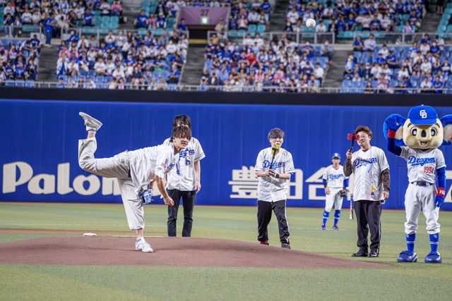 投球に関してはメンバー間で話し合った結果、バンド代表として任命されたPON(vo,g)が「こんな貴重な機会を頂けて光栄です。孫の代まで語り継ぎます。ライヴハウスで鍛えた火の玉ストレート、いきます!」とコメントし、セットポジションから全力投球。ボールはドラゴンズの捕手・加藤匠馬選手のミットに吸い込まれるように収まりました。