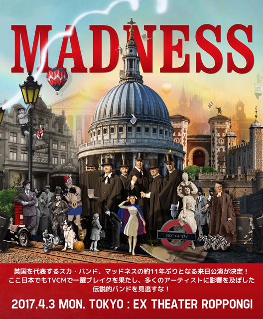 マッドネス(MADNESS)の約11年ぶりの来日公演が決定。4月3日(月)、東京・六本木 EXシアターにてライヴを行ないます。チケットはスタンディングが8,000円、指定席が9,000円(共に税込 / 別途ドリンク代)。一般販売は1月28日(土)開始。