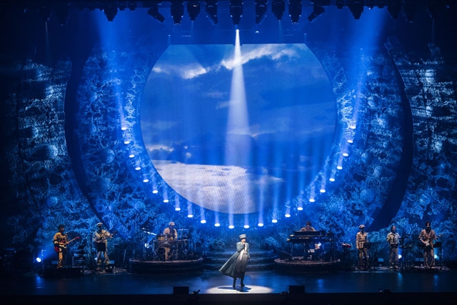 時空の意識を示唆する曲「不思議な体験」から、新たな衣裳でユーミンが中央に立ち、本題『Wormhole / Yumi AraI』の1曲目「DARK MOON」へと壮大に展開していく。ワームホールを想起させる円形の舞台装置も楽曲もプログレッシヴ・ロックの先駆者ピンク・フロイドを想起させ、しかも「不思議な体験」を収録した『VOYAGER』のアルバムジャケットを手掛けたのはピンク・フロイドの盟友ヒプノシスと、その縁までも浮かび上がる。“昔のままじゃない”と歌う「キャサリン」へ続くと、観客は現実と非現実の波間へと誘われていく。