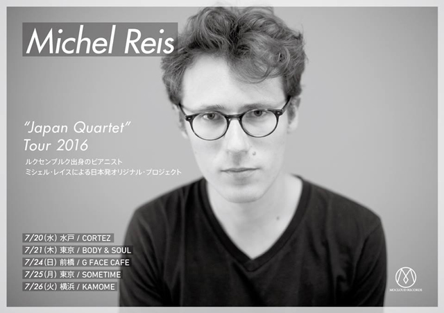 ルクセンブルク出身のジャズ・ピアニスト、ミシェル・レイス(Michel Reis)が須川崇志(b)、石若 駿(dr)、西口明宏(sax)ら、日本人メンバーと組む“ジャパン・カルテット”を始動させ、ライヴ・ツアーを行ないます。日程は7月20日(水)茨城・水戸 CORTEZ、21日(木)東京・南青山 BODY & SOUL、24日(日)群馬・前橋 G FACE CAFÉ、25日(月)東京・吉祥寺 SOMETIME、26日(火)神奈川・横浜 KAMOMEの5公演。