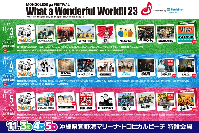 MONGOL800主催の野外フェス〈MONGOL800 ga FESTIVAL What a Wonderful World!!23〉(以下、モンパチフェス)の最終追加アーティストとタイムテーブルが発表されました。