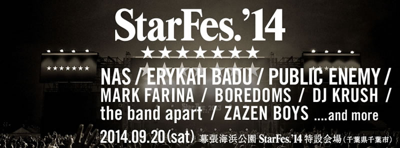 Nas。なんと9月20日(土)に千葉・幕張海浜公園の特設会場で行なわれる都市型音楽フェス〈StarFes.'14〉に出演することが決定しました!
