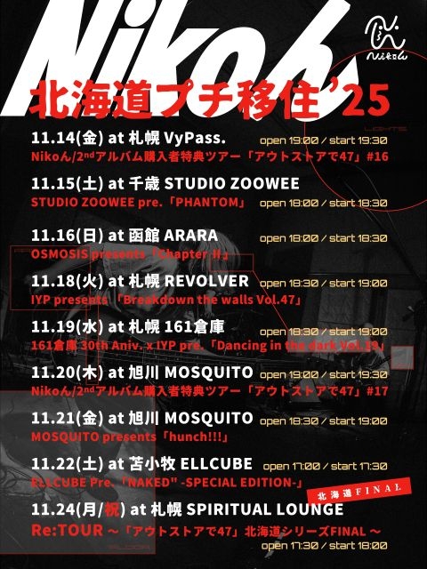期間は、11月14日(金)から11月24日(月/祝)までの11日間。その間、札幌を拠点に、旭川、千歳、函館、苫小牧を含む、9本のライヴを行います。