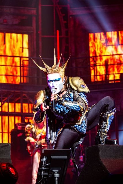 大黒ミサ中盤には構成員から信奉者へのメッセージが贈られ、その中で聖飢魔IIの歴史上初めてサポートギターとして大黒ミサに帯同したRENOファウストがルーク参謀から紹介されると、場内割れんばかりの歓声が送られた。RENOは聖飢魔II創始者であるダミアン浜田陛下に見出され、改藏人間となりヘヴィメタルバンド“Damian Hamada’s Creatures”のメンバーとなった。今回の聖飢魔IIの40周年ツアー前に発表された、ギターヒーローそして超絶テクニックを誇ってきたルーク篁参謀(G)の右手神経障害というコンディションの危機。同じさだめを背負う者として、ルーク参謀のギターパートを見事なテクニックで支え、立派にこの難局を共に乗り越えてくれたことに対し、構成員や信奉者からの熱い気持ちが会場中に伝わった瞬間である。大黒ミサ中後半は、35周年++のツアーで初参加し、サポートピアノ&キーボードとして今や信者の心をしっかり掴んでいるKAMISORI SYUTOの幻想的な独創ピアノ曲から、魔暦27(2025)年7月2日に発布されたCD大教典を中軸に「Kiss U Dead Or Alive」「有害ロック」「老害ロック」を立て続けに披露。さらに「Next Is The Best!」へつなぎ、本編ラストとなる「FIRE AFTER FIRE」では壮観な火柱が立ち上り、大黒ミサは熱狂のまま本編が締めくくられた。