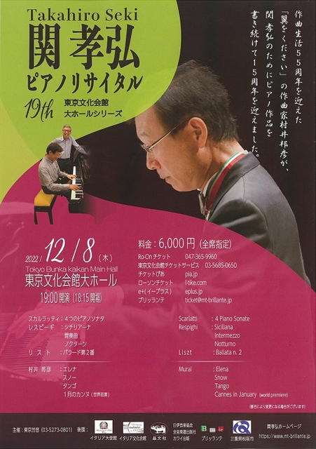 当日披露されるのは、スカルラッティ「4つのピアノソナタ」、レスピーギの「シチリアーナ」「間奏曲」「ノクターン」、リスト「バラード第2番」、村井邦彦の「エレナ」「スノー」「タンゴ」「1月のカンヌ」。村井は関のために曲を書きはじめ、今年で15年になります。