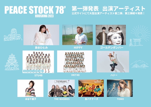 当イベントは、「平和感の共有、戦後継続している平和継続年数の共有」を目的として立ち上げたイベントであり、ロゴ内に表記の「78’」は戦後78年目という平和継続年数を周知することを意味しています。多くのメジャーアーティストをはじめ、地域で活躍するアーティストなどにも出演を依頼し、ステージから平和のメッセージを発信していきます。広島から発信していく音楽フェスで会場は「広島マリーナホップ・第二駐車場」と市内開催としては久々の地域密着型イベントになります。