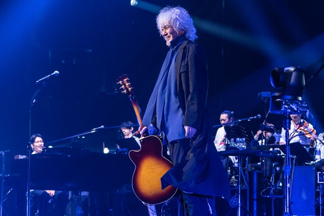 舞台中央に置かれていた青いバスカリーノを手にし、歌い始めたのは「青い“なす畑”」だ。大切な家、花咲くふるさと。柔らかな歌声が、聴衆を記憶の中にある故郷へと導いていく。8人の弦楽器隊と門田“JAW”晃介と武嶋聡のサクソフォーンによる前奏に続いたのは、アップテンポな「からっぽの心で」だ。悩んで疲れても、歩き続けて空を見上げようというメッセージを歌う。慈しむような眼差しで聴き手ひとりひとりを見つめるその表情はとても優しい。「それ以外に何がある」では、彼の音楽の本質的なテーマである“大切なものは何か”という問いかけを投げ掛ける。そして、祈りを捧げるかのように、言葉にならない思いをフェイクに注ぐ。歌い終えて深く頷くその笑顔がとても素敵だった。