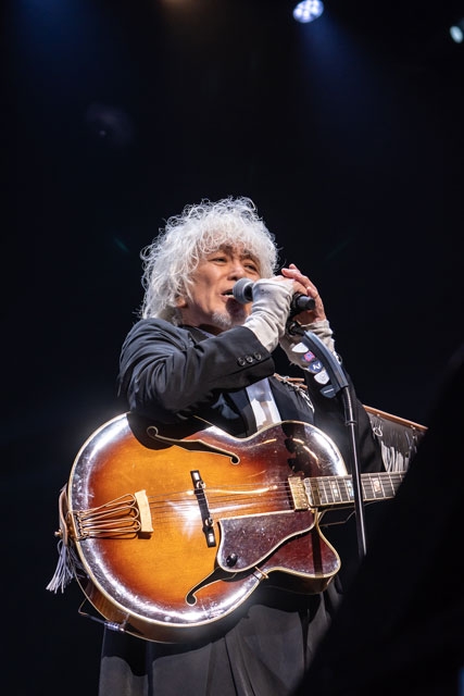 パーカッションの中北裕子がアフリカを起源としたウォータードラムを駆使し民族音楽の味付けも付加された「太陽さん」では、スケールの大きなバンドアンサンブルが高揚をかき立てていく。エンディングで玉置が爪弾くコクのあるエレキギターも味わい深かった。ベースの千ヶ崎学とドラムスの松原“マツキチ”寛が刻むエイトビートのロックンロールに乗せて“ガンバレ”と繰り返す「古今東西」では、その熱量に鼓舞された観衆が総立ちとなって呼応する。