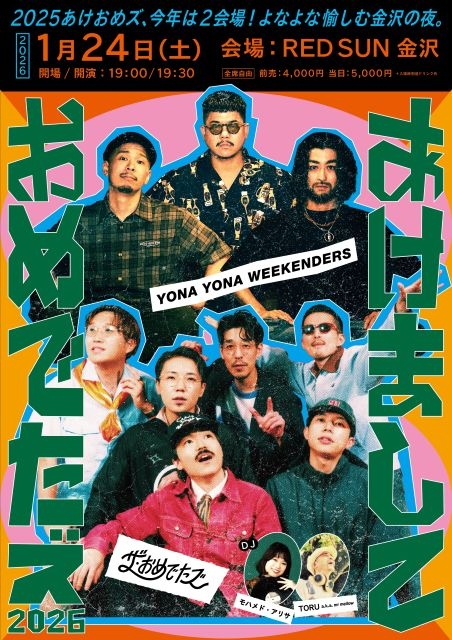 YONA YONA WEEKENDERSの出演が決定。こちらも初共演となり、〈あけましておめでたズ 2026〉としてザ・おめでたズの結成の地である北陸にYONA YONA WEEKENDERSを招致。新年の幕開けにふさわしい“おめでたい”ムードを届けてくれる一夜となること間違いなしの顔合わせです。ゲストDJはモハメド・アリサ、TORU a.k.a.mr.mellowが登場予定です。